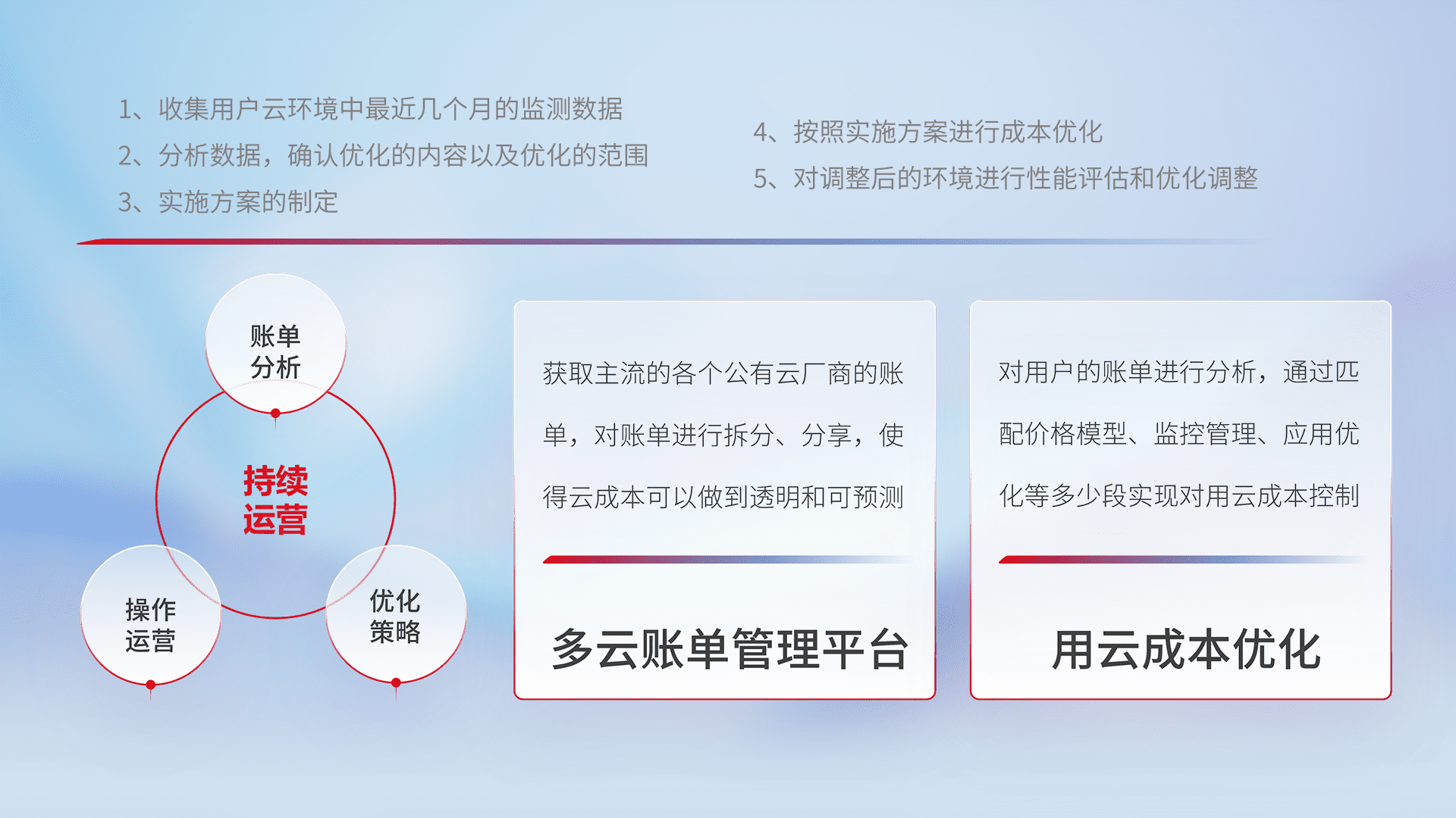 通过多云纳管,,,以统一的资源数据模型把客户的云资源进行抽象和封装,,,进而实现对多云资源的统一操作,,,,保障云资源管理的可靠性、、、、稳定性与可用性。。。。量身定制化运维内容,,,,配置、、开发运维、、、补丁管理、、备份、、监控、、、认证和访问管理、、、、审计和日常巡检等,,保障在用云过程中的可靠度,,稳定度以及高可用率。。。
